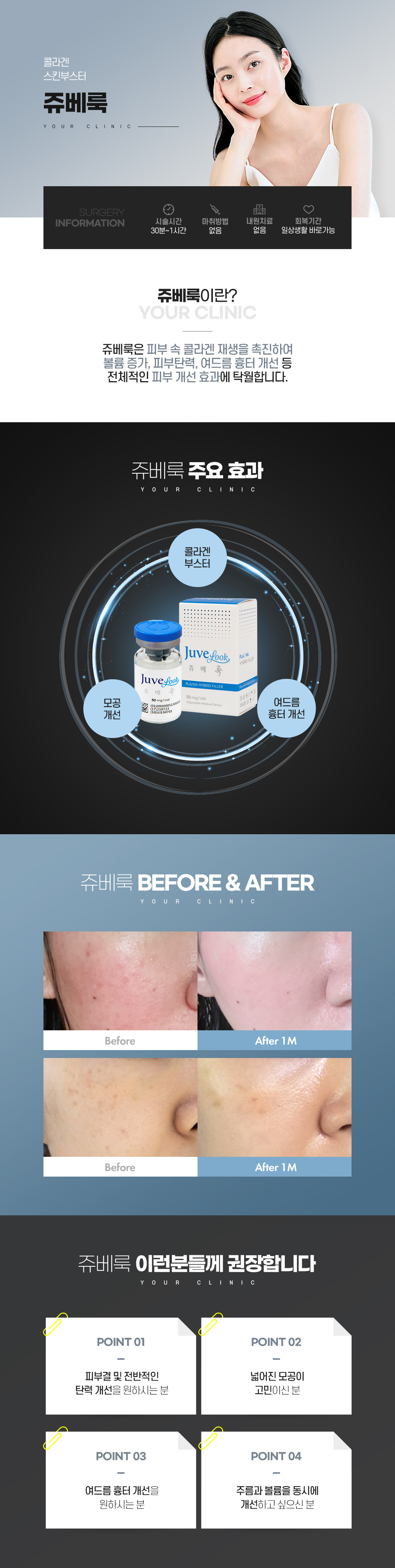 쥬베룩은 고분자 PLA와 인체 피부 조직에 존재하는 히알루론산을 결합시킨 자가 조직 재생 콜라겐 부스터입니다.